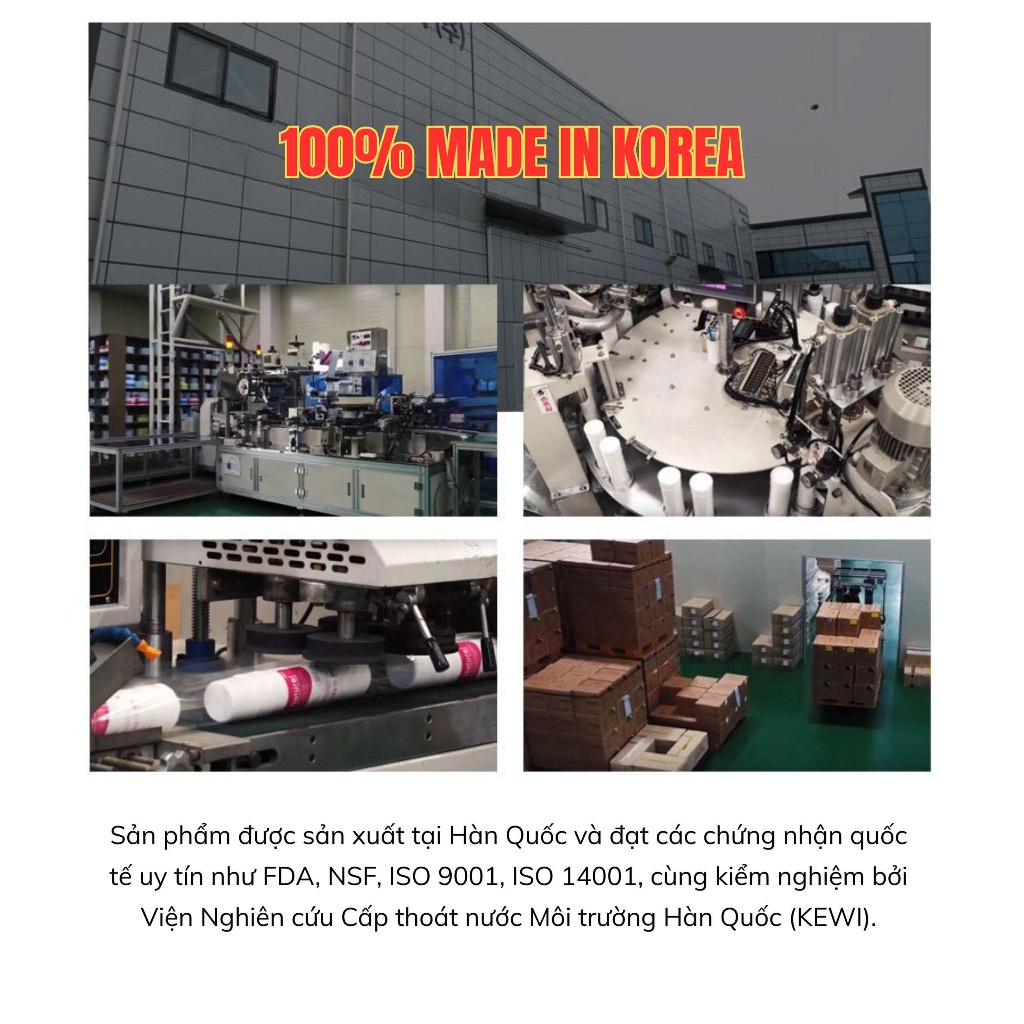 🌟Sản phẩm được sản xuất tại Hàn Quốc và đạt các chứng nhận quốc tế uy tín như FDA, NSF, ISO 9001, ISO 14001, cùng kiểm nghiệm bởi Viện Nghiên cứu Cấp thoát nước Môi trường Hàn Quốc (KEWI).