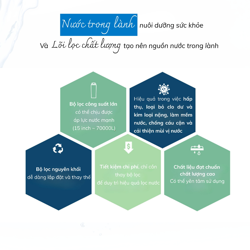 Hấp thụ và loại bỏ hiệu quả các thành phần clo dư (trihalomethane), chất hữu cơ và các thành phần khí, giúp loại bỏ mùi hôi và cải thiện hương vị tự nhiên của nước.